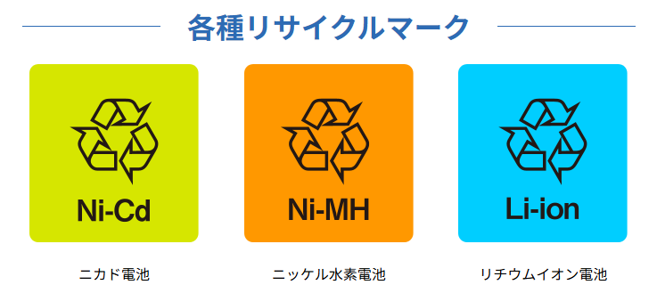 回収・リサイクルが必要であることを示す記号(スリーアローマーク)と電池の種類を示す英文字でリサイクルマークは構成されています。